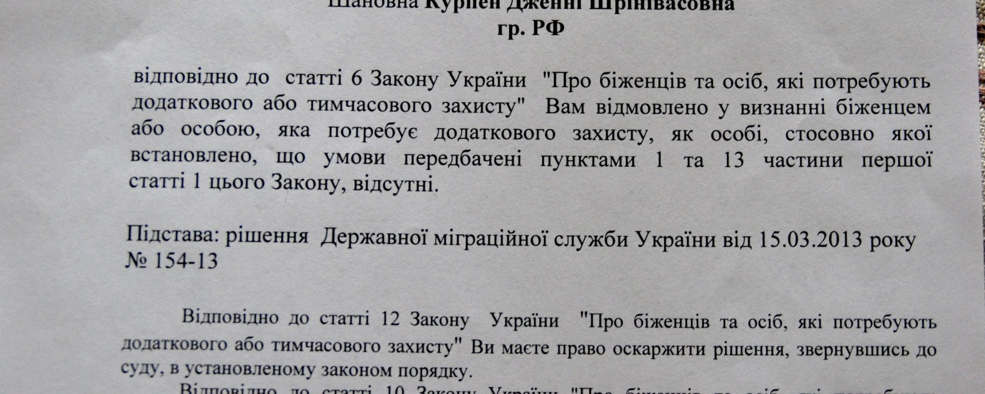 Решение Государственной Миграционной службы Украины было принято Главным Управлением службы по г. Киеву 22 марта 2013 г. В мотивировочной части решения указано, что данные искатели убежища не соответствуют определениям, данным в п.п. 1 и 13 ч.1 ст.1 закона Украины «О беженцах и лицах, нуждающихся в дополнительной защите».