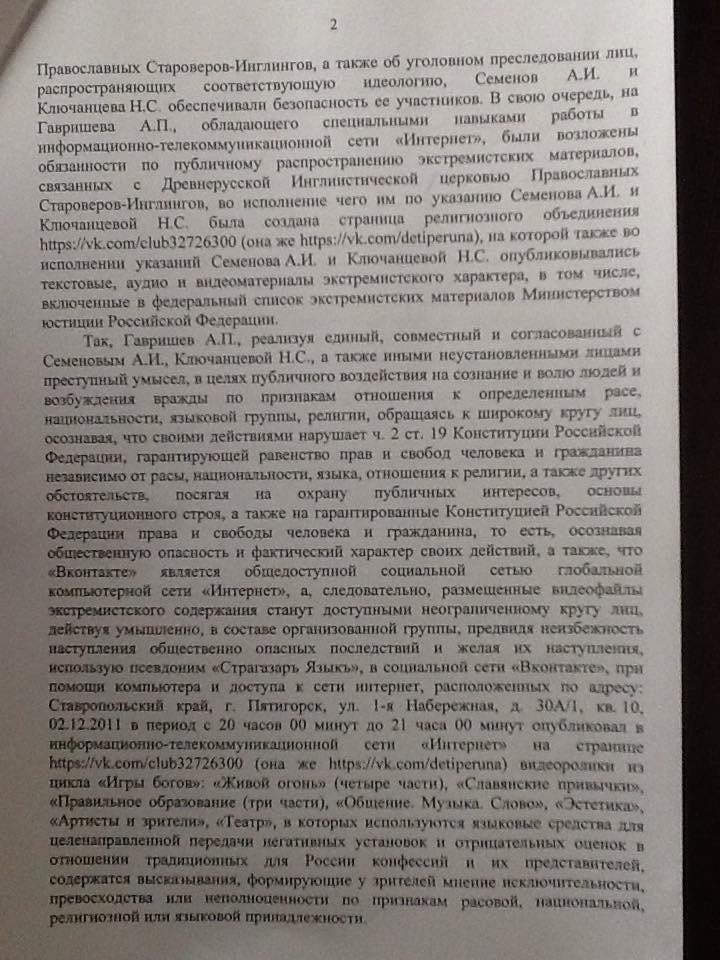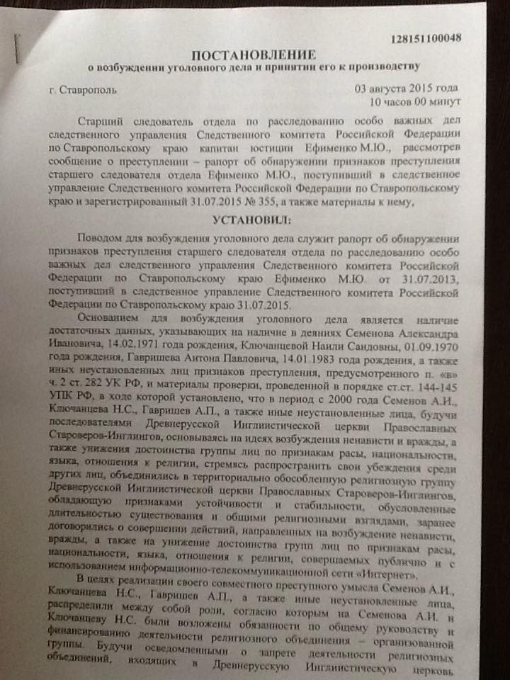 Все задержанные, как утверждает следствие, являются представителями Древнерусской Инглиистической Церкви Православных Староверов-Инглингов. Всего заведено два уголовных дела о возбуждении ненависти либо вражды, совершенном организованной группой (п. «в» ч. 2 ст. 282 УК). Подозреваемые по одному из них — администратор страницы «Дети Перуна» в соцсети «ВКонтакте» (в настоящее время доступ в нее возможен только по приглашению) Антон Гавришев, а также Александр Семенов и Наиля Ключанцева, по указанию которых, как говорится в постановлении о возбуждении дела, действовал Гавришев. Другое дело возбуждено в отношении Игоря и Галины Литвиненко.
