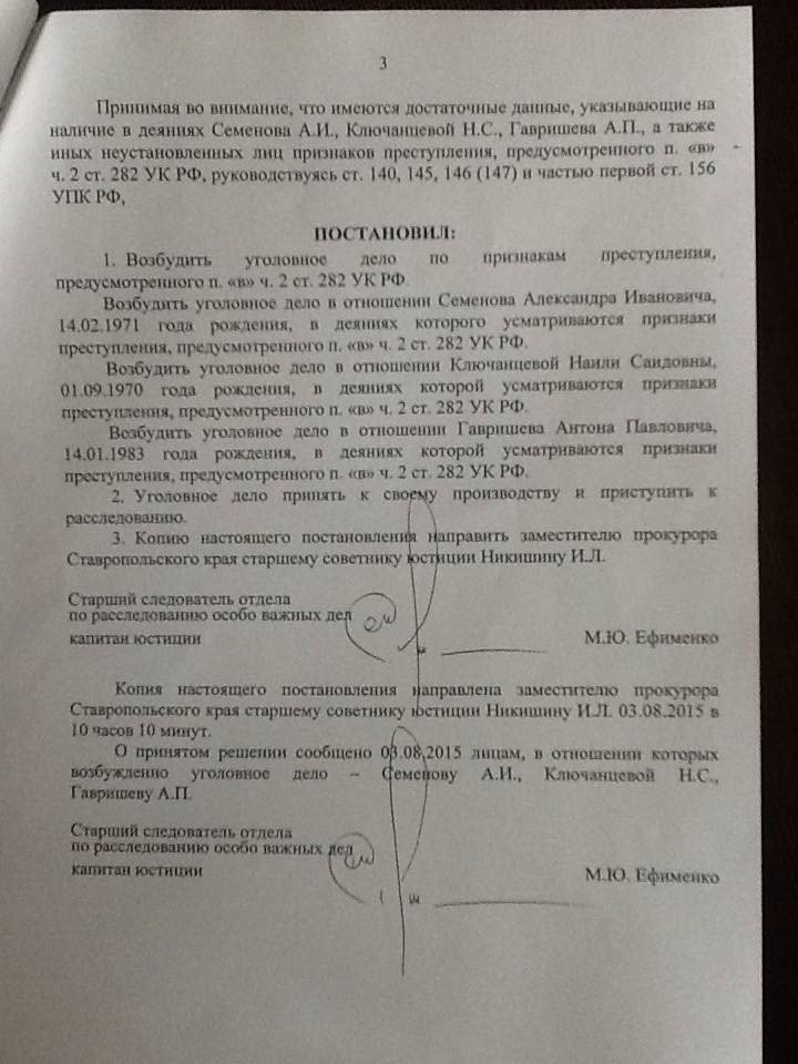 В постановлении о возбуждении уголовного дела в отношении Гавришева, Семенова и Ключанцевой, в частности, говорится, что они опубликовали ролики из документального цикла «Игры богов», в июне 2014 год признанного экстремистским: по замыслу авторов, этот фильм «раскрывает сущность древнеславянской культуры, обращает внимание русских людей на то, в каком мире мы сейчас живем и что нас окружает», снят «в жанре публицистики» на тему «исследования древней и современной славяно-арийской культуры». В чем конкретно обвиняются брат и сестра Литвиненко, ОВД-Инфо пока неизвестно.
