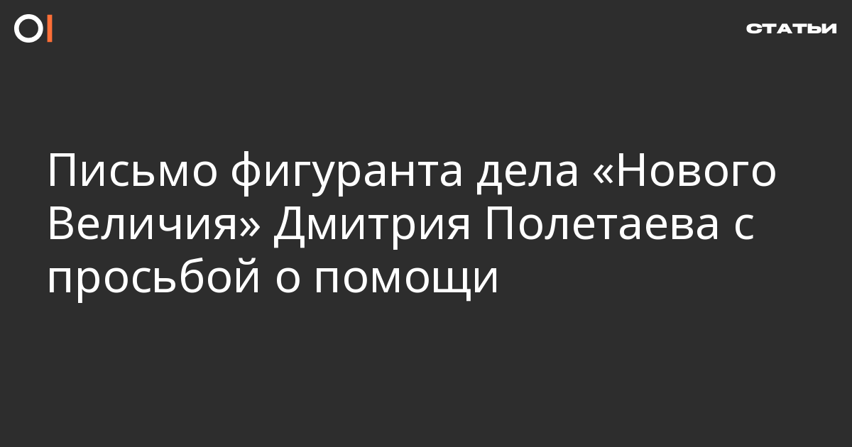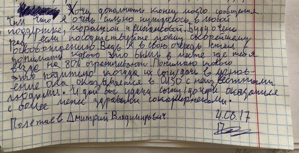 После освобождения из СИЗО Анны Павликовой и Марии Дубовик, двоих фигуранток дела об экстремистском сообществе «Новое Величие», в изоляторе всё еще остаются четверо обвиняемых по этому делу. Один из них — Дмитрий Полетаев. Его мать передала ОВД-Инфо письмо, в котором мужчина просит помощи.
