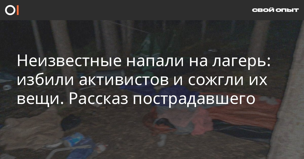 18 сентября в Красноярском крае люди в масках напали на палаточный лагерь, где отдыхали активисты «Гражданского общества», Либертарианской партии России и движения «Весна». Нападавшие избили активистов, сожгли их вещи и сломали телефоны. Полиция завела уголовное дело по статье о хулиганстве. ОВД-Инфо публикует рассказ одного из активистов, который был в лагере в момент нападения. Он пожелал остаться анонимным.