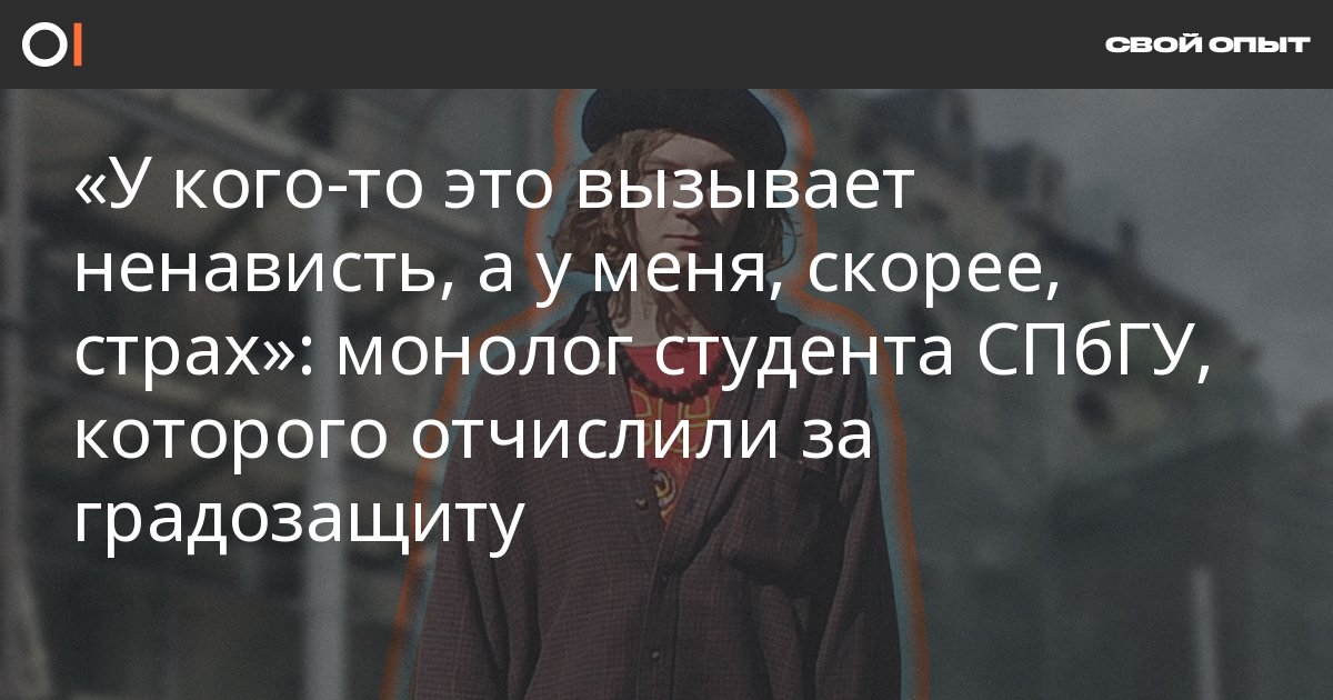 Вообще я сперва не очень хотел предавать огласке мое отчисление я решил просто уйти, «хлопнув дверью». Поэтому информация о нем появилась только через месяц. Документы, которые привели к отчислению (это в том числе некие письма петербургского главка ГУ МВД и российского министерства науки — ОВД-Инфо), я так и не увидел. Говорят, что их вообще сложно получить — СПбГУ не предоставляет.