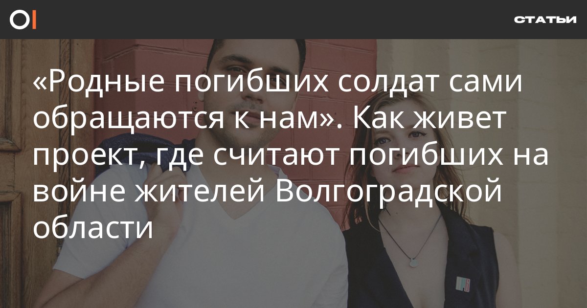 «У нас люди ходили по кладбищам в Волгограде и Волгоградской области, присылали много материалов, мы все эти могилы проверяли и искали людей в соцсетях, подтверждали, что они действительно погибли, проверяли по их соцсетям, верифицировали, — говорит Евгений. — Список приобрел масштаб и объем, к нам стали обращаться родственники и сослуживцы погибших, буквально присылали свидетельства о смерти. Часто там нарратив такой: „сыночек погиб, надо бы память о нем где-то оставить“. Волгоградским СМИ это часто не интересно, более того, как я знаю от местных журналистов, им запрещено писать о погибших больше определенного количества за какой-то период времени. Мы — единственные, кто в регионе этим занимается».
