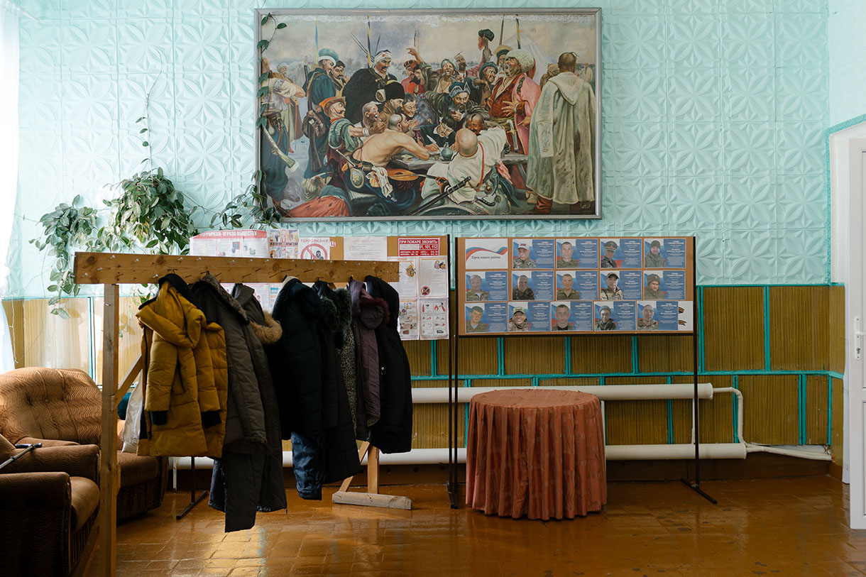 Мы приезжаем к этому ДК и замечаем внутри у самого входа репродукцию картины Ильи Репина «Запорожцы». По легенде, это сюжет времен войны Российской и Османской империй. На картине — вольные казаки. Под картиной стоит доска объявлений, на ней — литера Z, надпись «Герои нашего района» и четырнадцать листов с фамилиями и фотографиями погибших после 24 февраля 2022 года. Овчаренко, Руденко, Кислый…