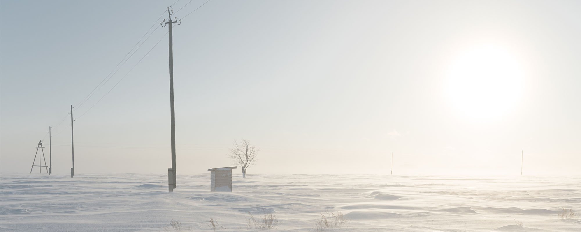 Село Одесское. Придорожное кафе. Заходят серьезные мужички, отряхиваются, фыркают, тревожно переговариваются. Они из Казахстана, границу пересекли — это 18 километров отсюда, а вернуться не могут — дорога закрыта, начинается буран. Поднимается ветер, холодный и хлесткий, он негромко завывает и тащит по дороге снежную крошку.