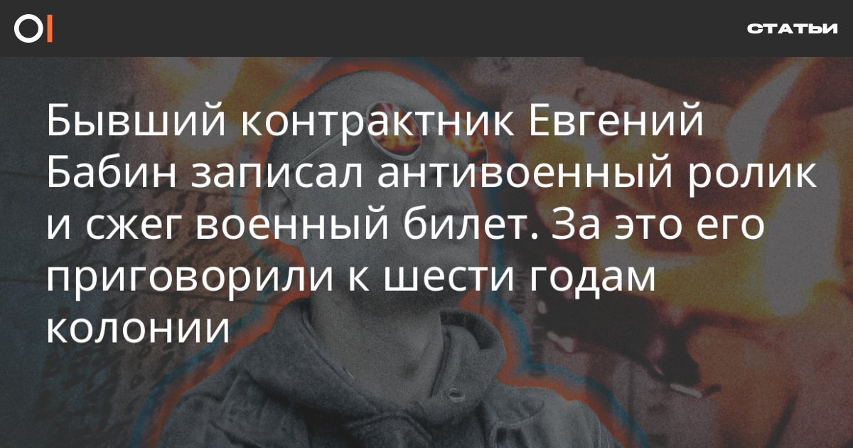 Жителя Курской области Евгения Бабина заочно приговорили к шести годам колонии за антивоенный ролик на канале с одиннадцатью подписчиками. Евгений — бывший военный. Он участвовал в оппозиционных митингах, отстаивал свои права на работе и перед местной администрацией. Мужчина смог уехать из России и сейчас налаживает жизнь в Армении. ОВД-Инфо поговорил с Евгением — о войне, протесте, деле и эмиграции.