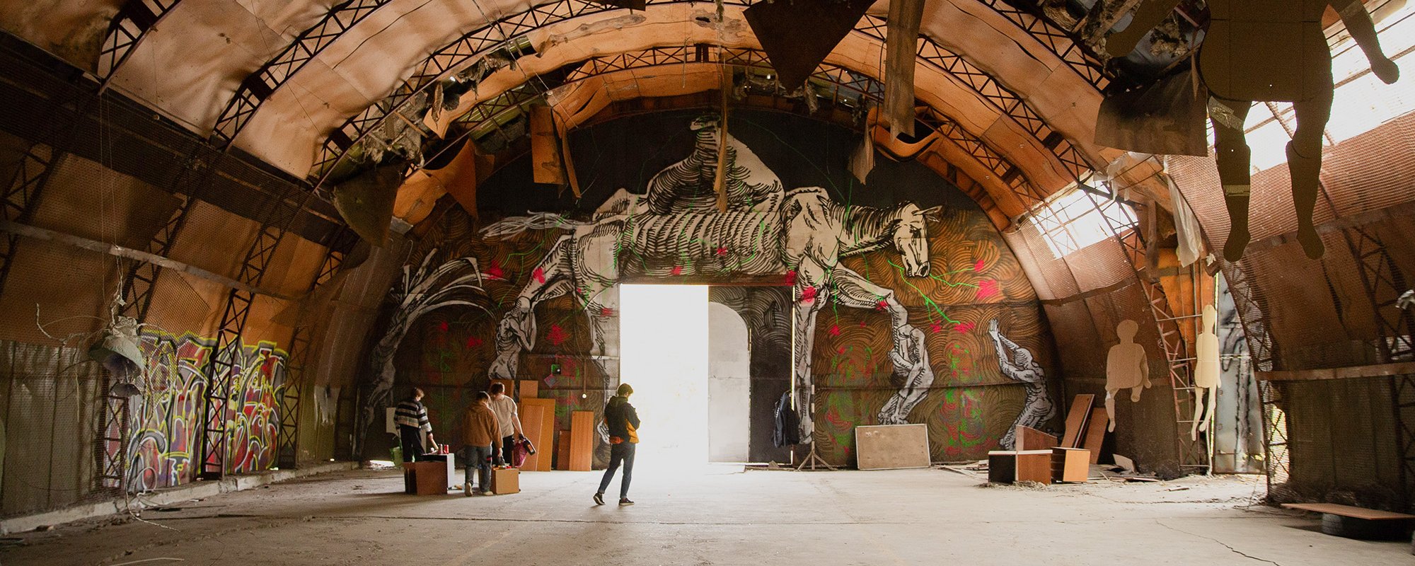 Выставка современного уличного искусства в рамках проекта ZABROSHKA и вечеринка после нее проходили на заброшенной территории Вокзального района. Это огромное пространство, где стоят пустые металлические ангары, бетонные коробки под склады и опустевшие деревянные дома. На один день эти помещения должны были занять художники.