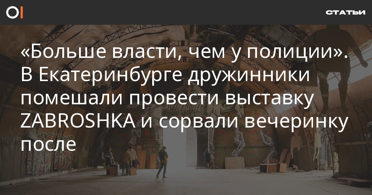 ZABROSHKA — сообщество уральских художников, которые проводят мероприятия в заброшенных локациях и зданиях. В Екатеринбурге они уже организовывали две однодневные андеграундные выставки, и «Заброшка Энтропия» должна была стать третьей. В день показа, 21 сентября, ее разогнали дружинники и полиция. Позже дружинники ворвались и на вечеринку художников — стреляли в воздух, угрожали оружием и уголовными делами, сильно избили одного из гостей. ОВД-Инфо поговорил с участниками событий.