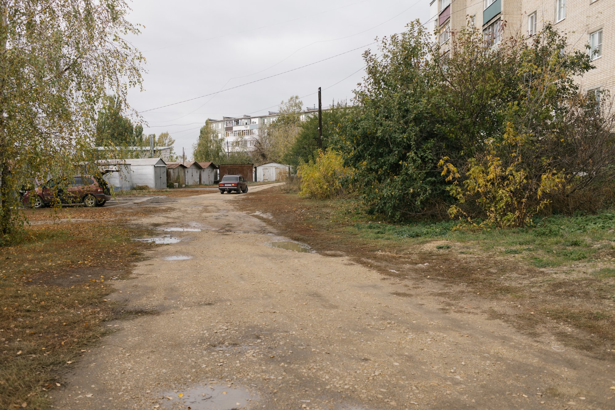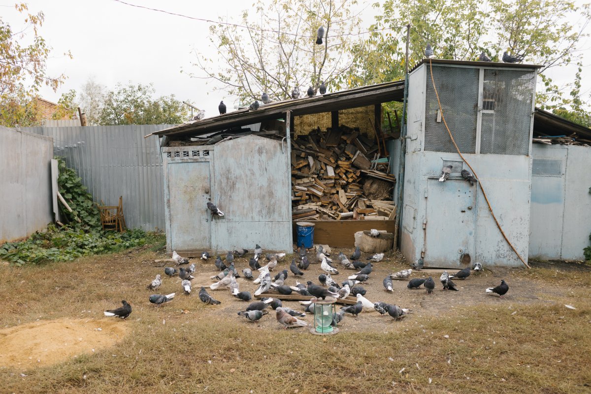 Отойдя от центра, выходим к тусклым рядам гаражей. Кто-то чинит машину, а около голубятни, расположенной между двумя гаражами, расхаживают, раздувая шеи, голуби. Напротив них сидят и курят двое немолодых мужчин.