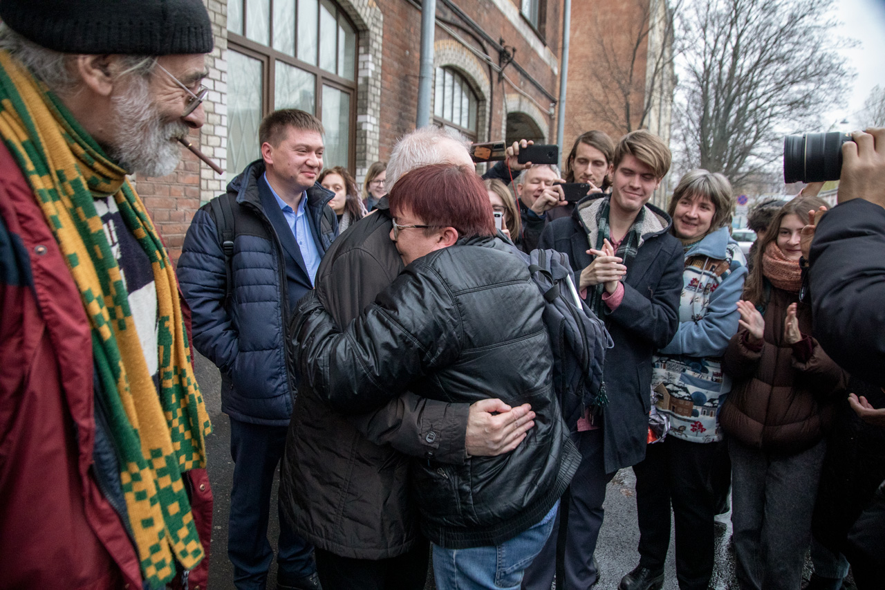Евгений обнимается с Людмилой Дубовой, которая координировала сбор средств и передачи в СИЗО / Фото: Алексей Душутин, «Новая газета»