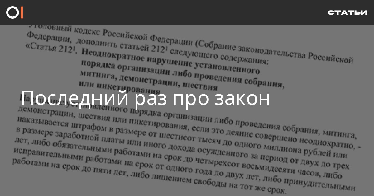 На прошлой неделе наконец вступил в силу новый закон, призванный карать за использование гражданами права выйти на площадь, гарантированного им 31-й статьей Конституции, он же — закон «О внесении изменений в отдельные законодательные акты Российской Федерации в части совершенствования законодательства о публичных мероприятиях». ОВД-Инфо уже опубликовал ряд материалов на эту тему, и нет смысла останавливаться на юридических аспектах или банальной соразмерности новых «митинговых кар» с наказаниями за более очевидные уголовные преступления.
