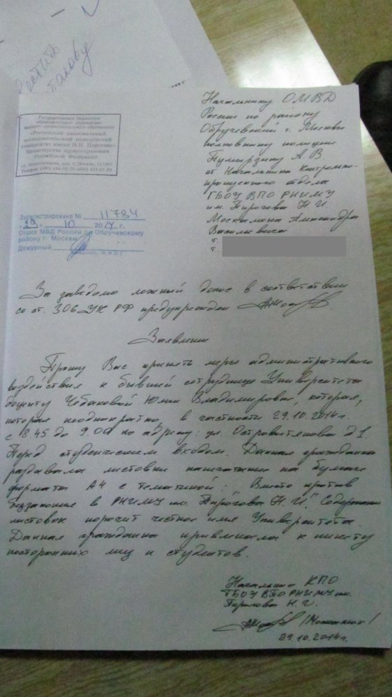 Позднее выяснилось, что служба безопасности РНИМУ предоставила полиции большое количество документов, представляющих задержанных в дурном свете. «Видимо, у них была очень большая заинтересованность, чтобы создать нам какие-то неприятности», — предполагает Чебакова. Среди документов были заявления начальника службы безопасности о том, что активисты проводили пикет, «который порочит университет», а Чебакова и Паршуков привлекали студентов и посторонних лиц к распространению листовок (на каждого было составлено отдельное заявление). Прилагались и совсем не относящиеся к делу характеристики декана факультета, где работали активисты. Про Паршукова говорилось, что помимо «злостных нарушений трудовой дисциплины», «в конце 2013 г.… стали проявляться нарушения этического характера, деятельность антиправительственного характера, и демонстративное поведение, направленное против администрации Университета, наблюдались попытки вовлечения в эту деятельность студентов». Отдельно отмечалось, что Паршуков «неоднократно участвовал в митингах и пикетах, в частности, на Болотной Площади». О Чебаковой говорилось, что она всегда отличалась неисполнительностью, однако она попросилась на должность замдекана, чтобы исправиться, но быстро потеряла интерес к этой деятельности и стала злостно нарушать трудовую дисциплину, в связи с чем была уволена. К делу приобщили также два свидетельских показания студентов факультета, которые писали, что им дали листовки, а также протоколы заседания университетского профкома и служебные записки и.о. председателя о том, что Чебаковой и Паршукову никто не давал задания раздавать листовки и что они не имеют отношения к профсоюзу, признанному официальным руководством.