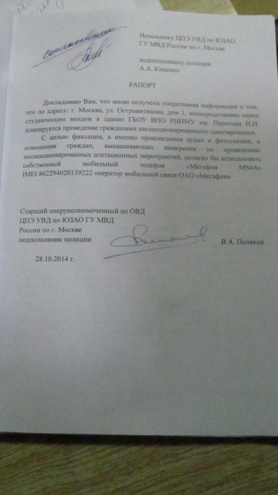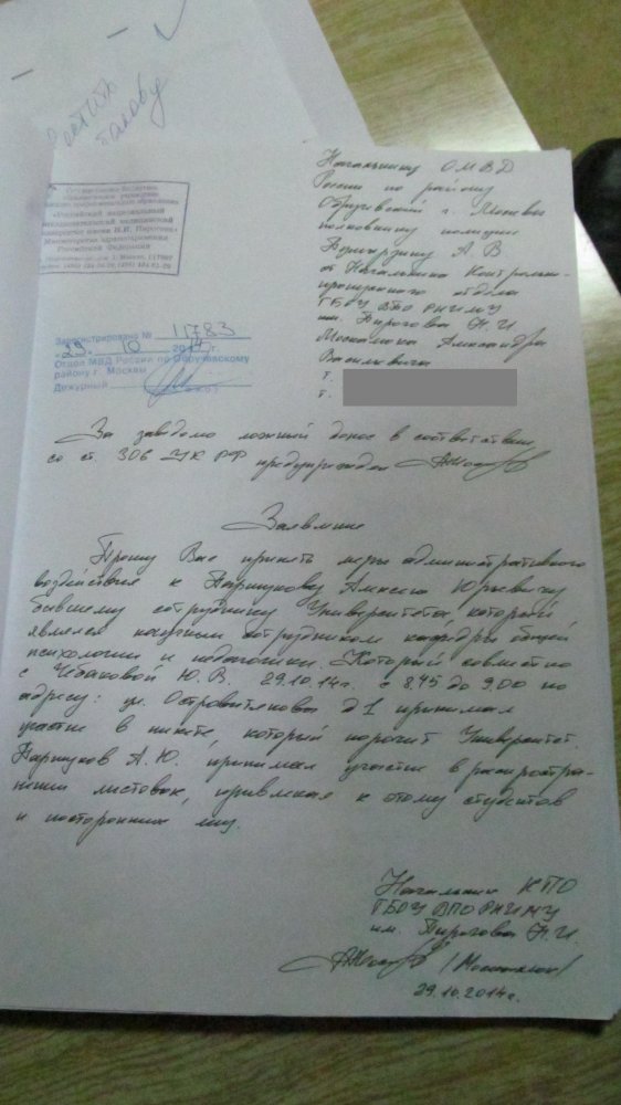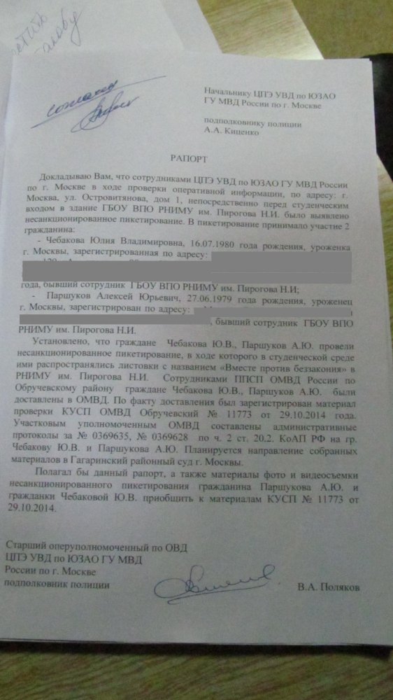 А задержанных Чебакову, Паршукова и Бределева отвезли в ОВД «Обручевский» и потребовали писать объяснения. На лекции и конференцию не отпускали. Через некоторое время на Чебакову и Паршукова начали составлять протоколы по ч. 2 ст. 20.2 (организация либо проведение публичного мероприятия без подачи в установленном порядке уведомления о проведении публичного мероприятия). При этом почему-то требовали указать место работы. По словам Паршукова, администрация РНИМУ сообщила полиции, что «Университетская солидарность» не является профсоюзной организацией. Полицейские потребовали от Чебаковой и Паршукова подписаться под требованием 30 октября явиться в суд (в какой суд и в котором часу, не сообщалось), но тем удалось договориться, что им пришлют повестки. Ни протокол задержания, ни протокол доставления составлены не были. В общей сложности задержанные провели в ОВД больше восьми часов.