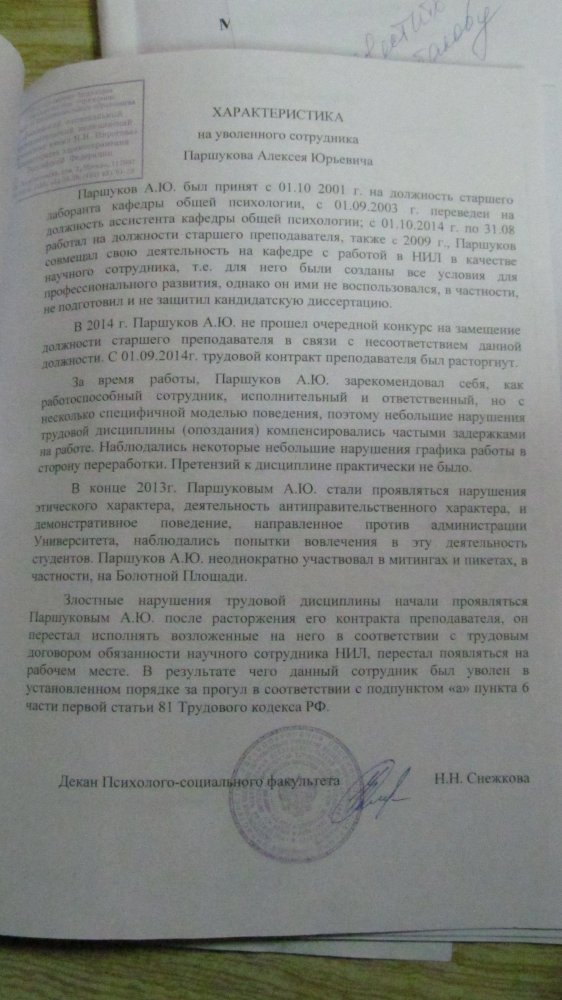 1 сентября Алексея Паршукова уволили с должности старшего преподавателя общей психологии и педагогики на основании того, что он не прошел конкурсный отбор. По словам Чебаковой, впервые за десять лет конкурс был не формальной процедурой, а соревнованием с привлечением кандидата со стороны. Члены профсоюза утверждают, что по их сведениям на кафедру сильно давили, чтобы она не рекомендовала Паршукова. При этом кандидат, который прошел конкурсный отбор и фактически занял место Паршукова, на эту работу так и не устроился. На тот момент Паршуков еще работал в лаборатории вуза по совместительству как научный сотрудник, однако в конце сентября у него перестал работать пропуск, в результате чего он не мог попасть на территорию университета, а спустя пять дней он получил телеграмму о том, что с ним расторгнут трудовой договор. «Ему даже не позвонили, не пригласили с этим приказом ознакомиться», — возмущается Чебакова. В суде Паршуков указал на нарушение Трудового кодекса — конкурс был проведен через два года после предыдущего, а не через пять лет, как было положено по бессрочному трудовому договору, который вуз заключил с Паршуковым. Однако суд принял решение отказать ему в удовлетворении искового требования.