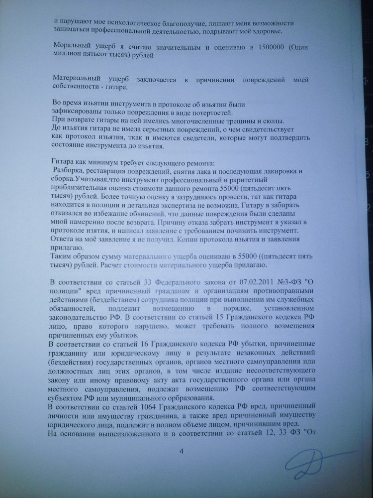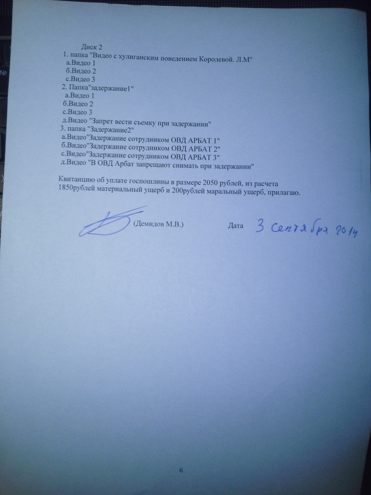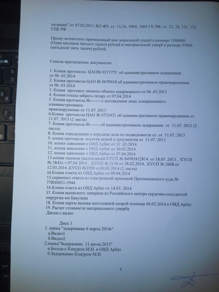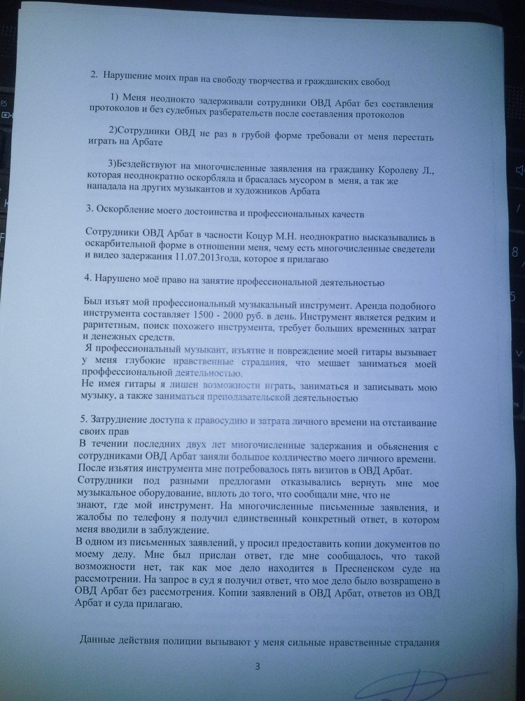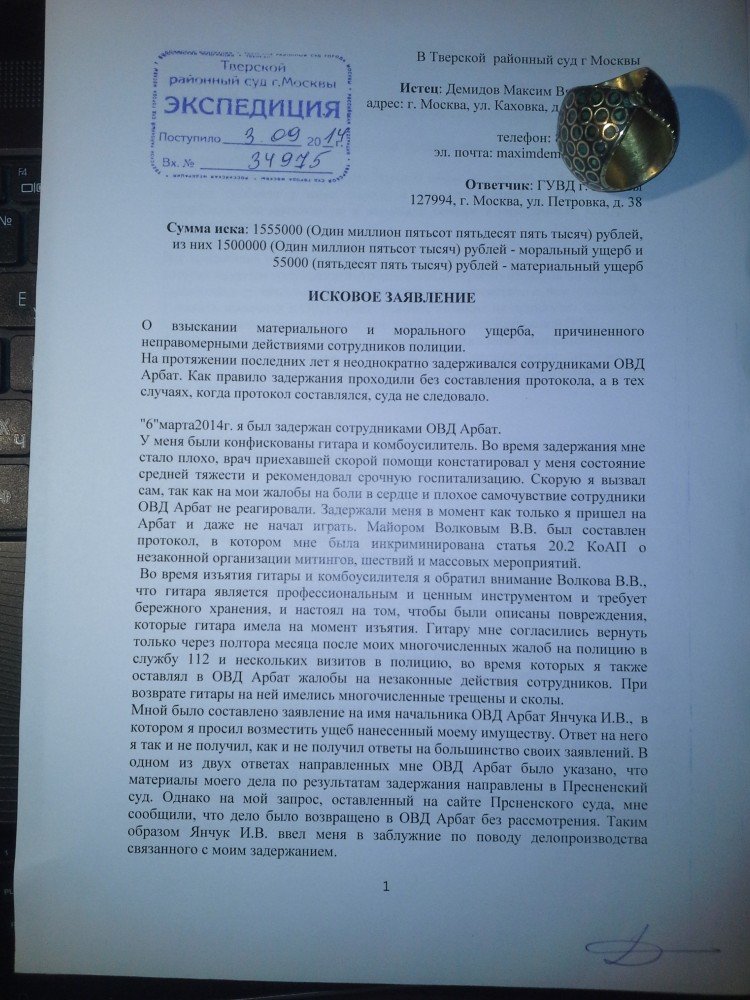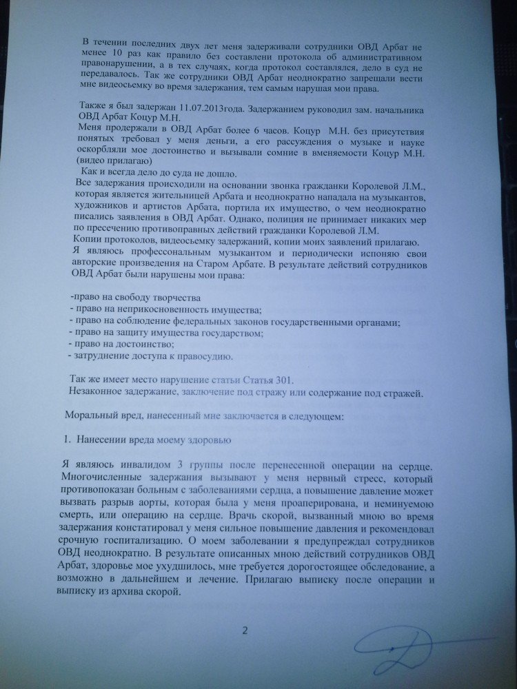 В настоящее время в Тверском суде проходит судебное разбирательство по иску гитариста Максима Демидова. Он требует от полиции возмещения материального и морального ущерба в связи с задержанием 6 марта 2014 года. На него составили протокол по статье 20.2 КоАП, обвинив в организации несогласованного публичного мероприятия. У него тоже был конфискован инструмент. Кроме того, у Демидова, инвалида 3-й группы, перенесшего операцию на сердце, в ОВД случился приступ, ему вызывали «скорую». Моральный ущерб музыкант оценил в 150 тысяч рублей, материальный — в 55 тысяч. Демидов написал в исковом заявлении, что полицейские вернули ему гитару только через полтора месяца, и то после многочисленных жалоб, и он обнаружил на инструменте многочисленные трещины и сколы. В протоколе об изъятии было написано только, что на гитаре имеются потертости. На суде, по его словам, выяснилось, что составлявший протокол сотрудник ОВД был «уставший» и «на трещины и сколы внимания не обратил», поэтому в документе их не описал, но через несколько дней увидел на гитаре незамеченные ранее повреждения и составил новый протокол. «Теперь в деле два протокола изъятия», — заключает Демидов (напротив, по одному из других административных дел, заведенных на него, протоколы были якобы случайно, по ошибке уничтожены вместе с архивными документами). Сергей Садов должен был выступать свидетелем по его делу, и Демидов не исключает, что его задержание связано именно с этим. Гитару Демидов забирать из полиции не стал и на Арбате уже год как не играет.