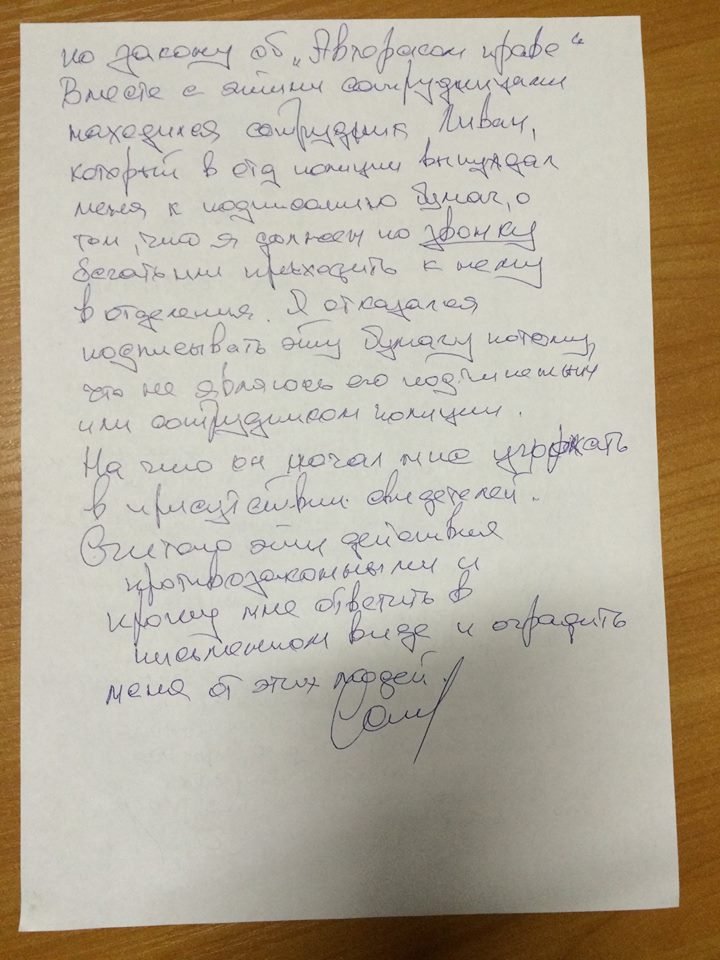 «В отделе надо мной издевались. Надо было подниматься на шестой этаж, а у меня было тяжелое оборудование. Я полицейским говорю: „Помогите, вы же помоложе“. А они: „Мы тебе неотложку вызовем, если тебе будет плохо!“ И я таскал все сам наверх, вниз — гестапо такое», — рассказывает Садов. По его словам, от него потребовали подписать бумагу, что он должен будет явиться в ОВД по первому звонку. Музыкант отказался, заявив, что может явиться, только если ему придет повестка.