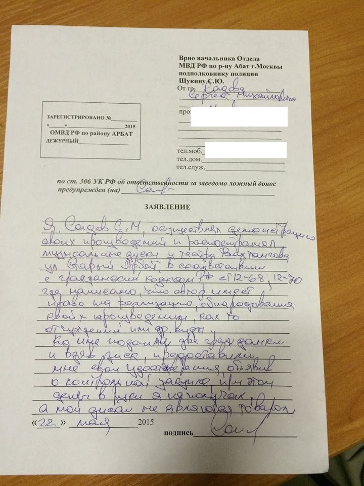 Несколькими днями ранее Садов был тоже задержан и доставлен в ОВД «Арбат». Это произошло в результате так называемой контрольной закупки: по словам музыканта, полиция отправила к нему «двух школьниц», чтобы они купили у него диски с его музыкой, которые он, по мнению сотрудников ОВД, незаконно продает. «Они диски взяли, а деньги дать забыли! — рассказывает Садов. — А я в это время только высадился, и денег у меня не было. Получается, меня задержали, привезли в отдел, отняли у меня диски, говорят: доставай деньги. Я говорю: „Так у меня денег-то нету!“ Они и сели. Получилось, что они забрали человека, отняли у него все, а предъявить нечего. Тогда они меня выпустили, ничего не составили. А при этом диски не вернули, никто не собирается их возвращать, себе на сувениры растащили».
