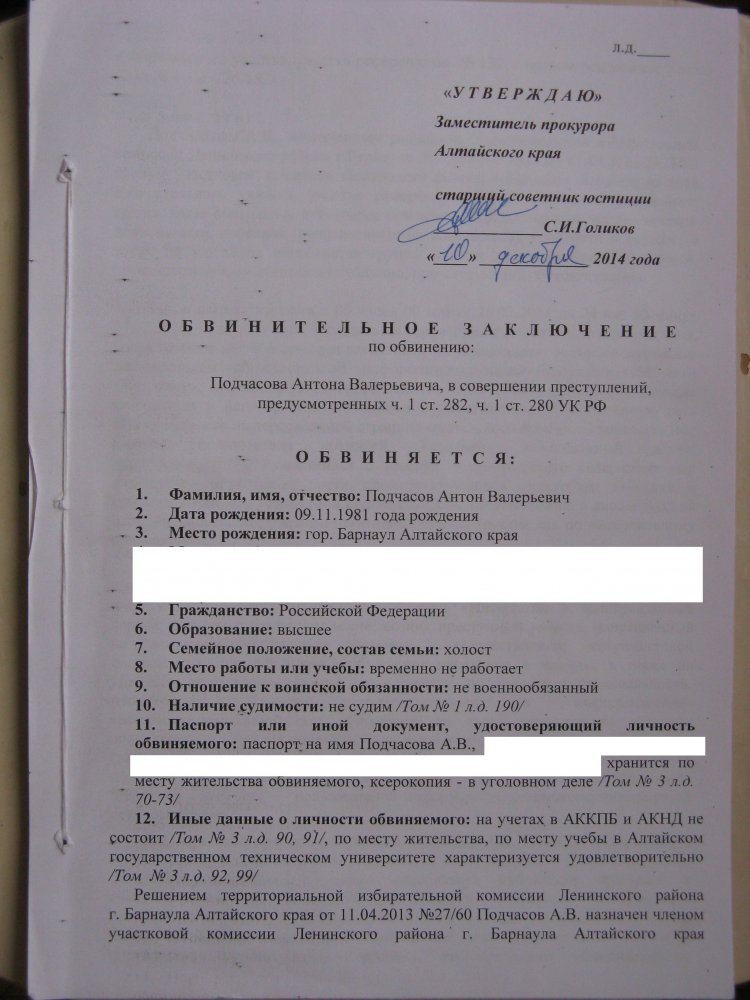 В Барнауле завершается судебный процесс по делу местного оппозиционного активиста Антона Подчасова. Его обвиняют в публичных призывах к экстремистской деятельности (1-я часть ст. 280 УК) и «действиях, направленных на возбуждение ненависти, вражды, а также на унижение достоинства группы лиц по признакам расы, национальности, происхождения, совершенные публично» (1-я часть ст. 282 УК). По версии следствия и обвинения, выразилось это в том, что Подчасов сделал на своей странице в соцсети «ВКонтакте» републикацию текста «Русофобии пост». Прокурор в ходе прений попросила приговорить активиста к трем годам лишения свободы условно.