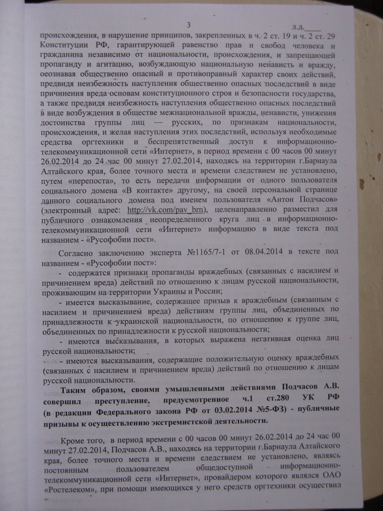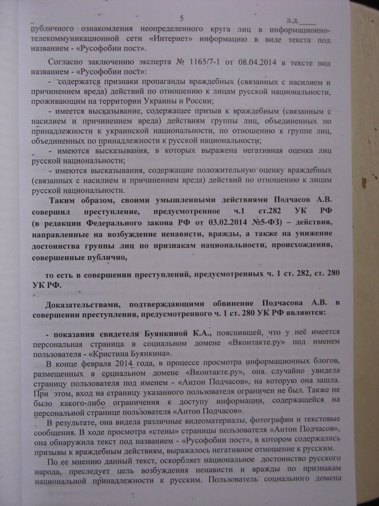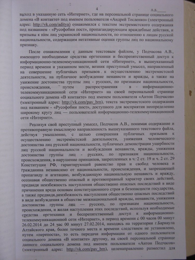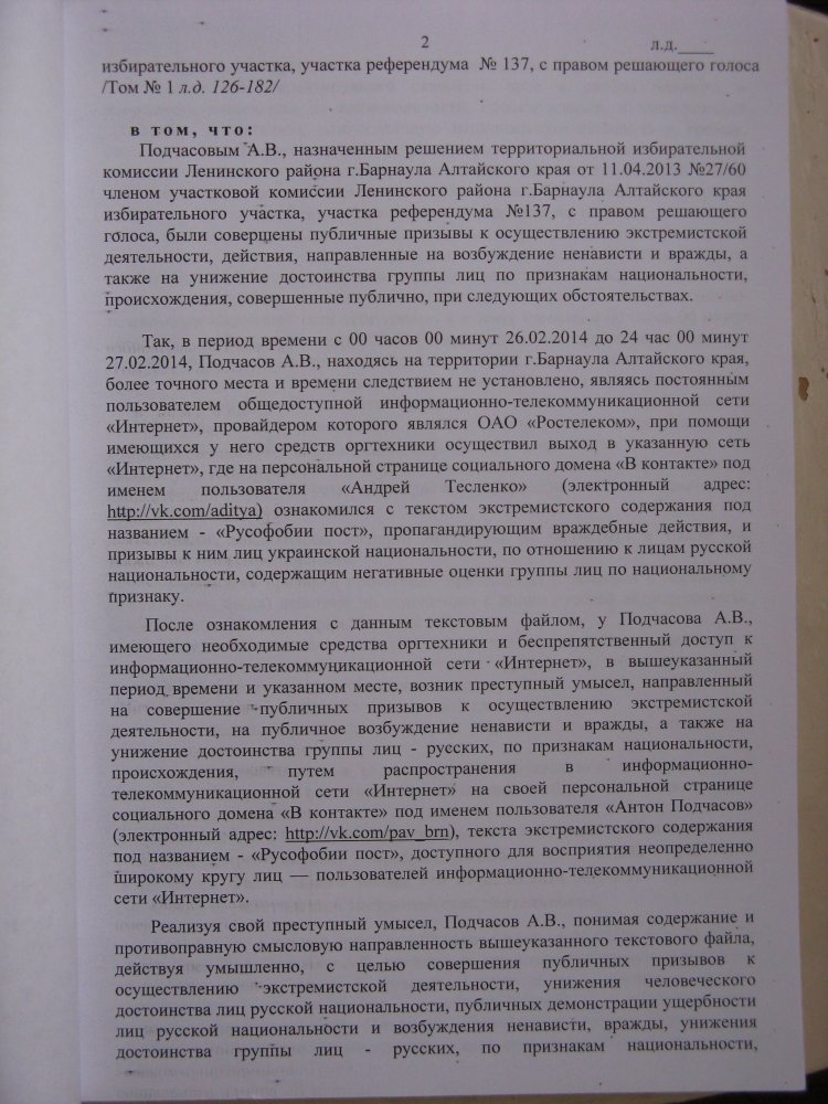 Адвокат продолжала настаивать на том, что дело следует прекратить, и один из главных аргументов состоял в том, что Подчасова обвиняют по двум статьям Уголовного кодекса за одно и то же. Действительно, в обвинительном заключении обоснования обвинения по ст. 280 и ст. 282 абсолютно идентичны.