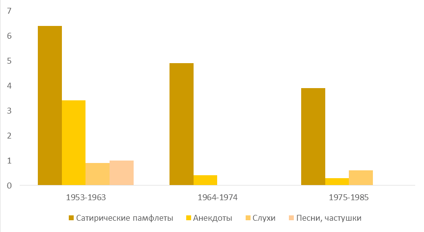 Однако в начале 1960-х годов стратегия советских карательных органов меняется: устные жанры, составлявшие значительную часть репрессированной крамолы в период с 1953 по 1963 год, практически исчезают из поля зрения власти. Она почти перестает интересоваться слухами, песнями и анекдотами. На первый план выходит что-то вроде политического народного памфлета («У Лукоморья дуб срубили, златую цепь в Торгсин снесли…»), близкого к наивной литературе. Такую «антихрущевскую пропаганду» в середине 1960-х часто находили в местах скопления народа, например, в туалетах или на остановках: «А Никита, словно птица, стал летать по заграницам…». Такие тексты распространялись письменно, а не устно, и именно они, вместе с другой письменной крамолой — политическим Самиздатом и наивной религиозной литературой, — в 1970-80-е навлекали репрессии на своих авторов и распространителей.