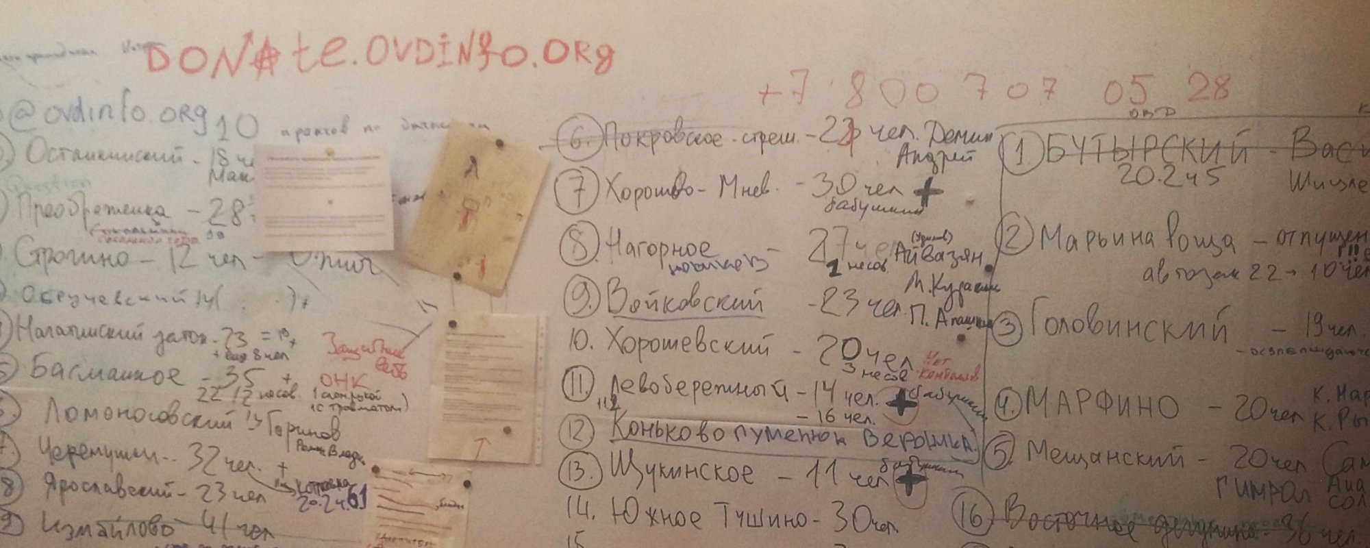 В первые дни после 26-го ОВД-Инфо продолжил принимать звонки и собирать информацию о тех московских отделах, с которыми пропала связь после того, как у задержанных были отобраны телефоны.