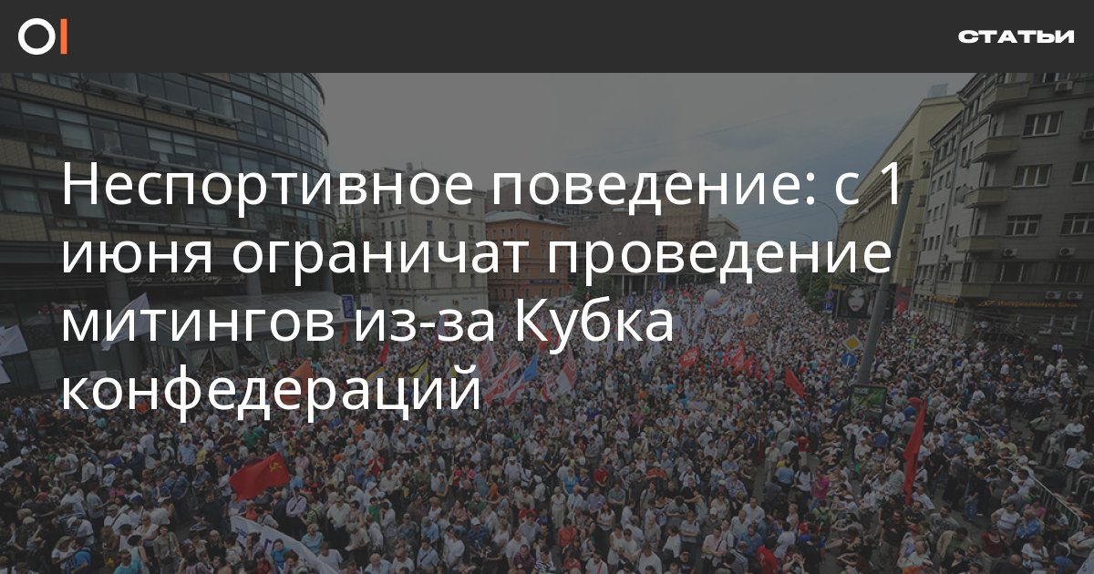С 1 июня по 12 июля 2017 года в ряде регионов России вводятся особые меры безопасности из-за проведения Кубка конфедераций — международного соревнования по футболу в преддверии чемпионата мира. Ограничения, введенные указом президента Владимира Путина, коснутся в том числе свободы проведения публичных мероприятий. ОВД-Инфо рассказывает, что именно затронет указ и что о нем думают юристы.