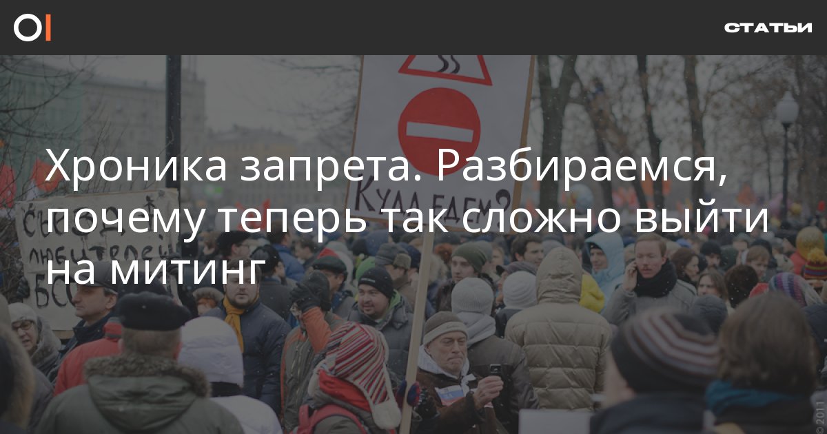 Пять лет назад вступил в силу закон, который сильно ограничил право на свободу собраний. ОВД-Инфо подготовил хронику законов и поправок, которые затрудняют выход на митинг (и не только), — с июня 2012 года до настоящего времени.