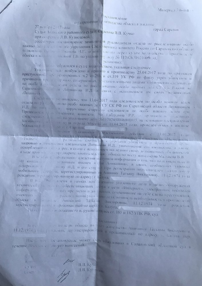 К ней зашли восемь крепких мужчин и показали постановление об обыске от 27 ноября, выданное судьей Волжского районного суда Саратова Виктором Кучкой. Сказали, что в отношении неустановленного лица заведено дело по второй части статьи 296 УК (угроза или насильственные действия в связи с осуществлением правосудия) и по статье 319 УК (оскорбление представителя власти) из-за угроз в адрес следователя по расследованию особо важных дел следственного отдела СК по Саратовской области Ильи Литвинова.