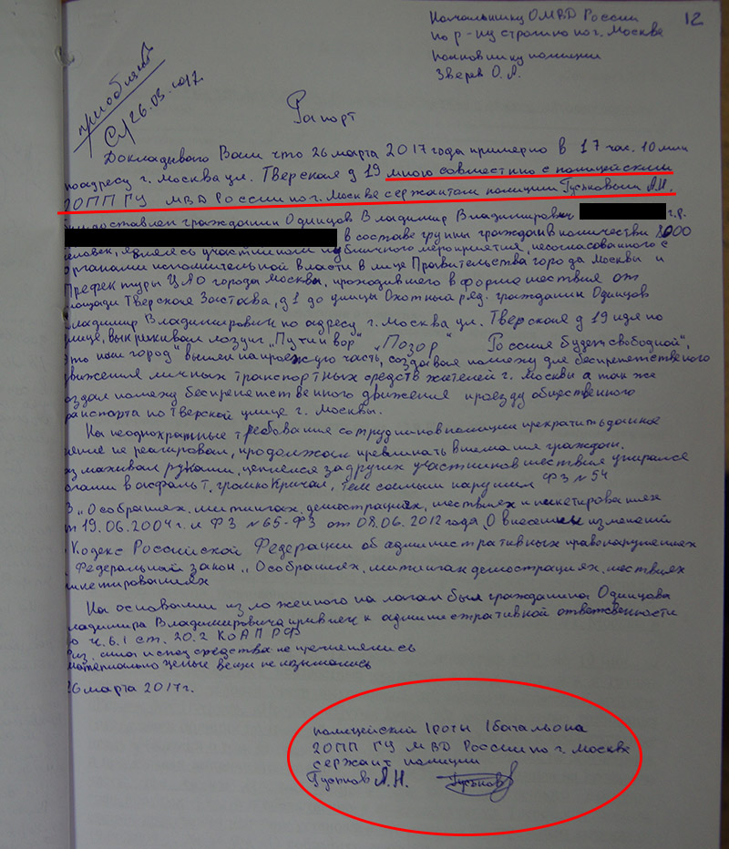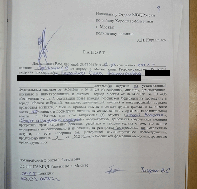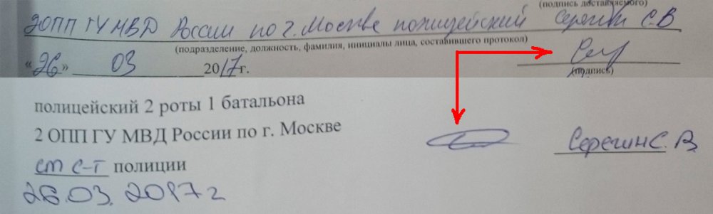 Спустя год после протестов и массовых задержаний 26 марта 2017 года и огромного количества судов, ОВД-Инфо публикует анализ некоторых полицейских материалов по задержаниям в Москве. Они показывают уровень правового нигилизма полицейских, их оформлявших. Рапорты составлялись «под копирку», на официальных бумагах присутствуют явные признаки подделки подписей.