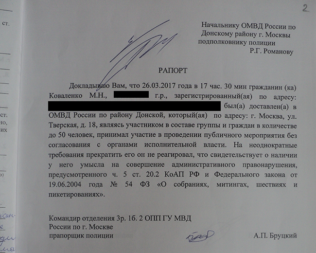 Другой типовой вид рапорта — «индивидуальный». Фамилия задержанного наряду с личными данными и обстоятельствами «правонарушения» сразу печатается на компьютере. Однако, как мы видим на примере ниже, свободу определения пола задержанного, как и в «универсальной» бумаге, полицейским оставили. Впрочем, сотрудники 2-го оперативного полка Бастрыкин и Бруцкий не стали утруждать себя выбором нужных словарных форм и просто подписали абсолютно одинаковые рапорты, текст которых в принципе слабо поддается пониманию (в нем описывается, как отдел полиции по Донскому району принимал участие в акции на Тверской улице).