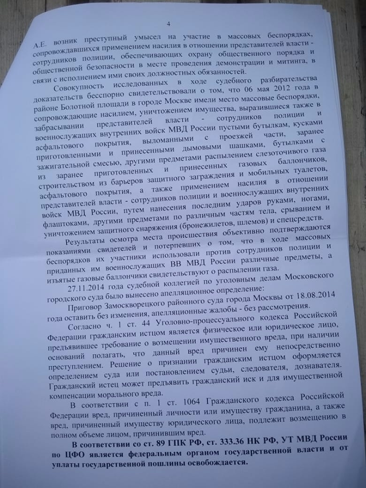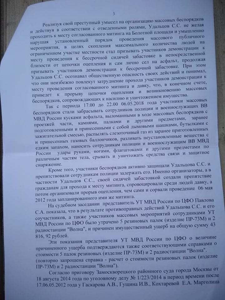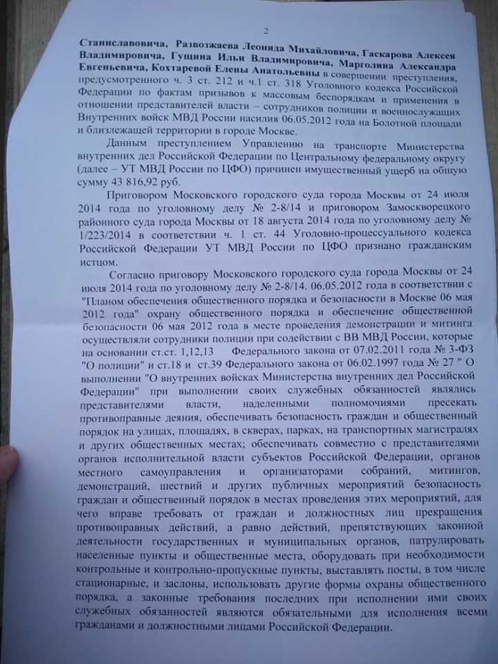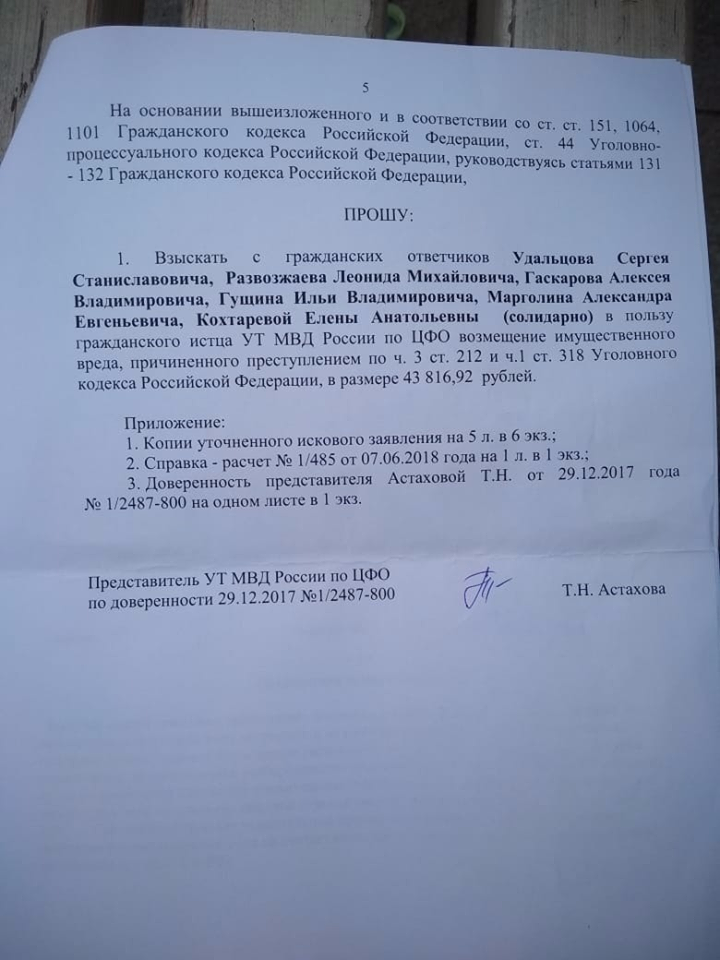 Иск начнут рассматривать 11 июля в 242-м судебном участке района Нагатинский затон. Это подразделение МВД направило требование возместить ущерб только к Сергею Удальцову, Леониду Развозжаеву, Илье Гущину, Елене Кохтаревой, Александру Марголину и Алексею Гаскарову. В распоряжении ОВД-Инфо есть текст искового заявления. В нем не упоминаются другие осужденные по «Болотному делу» — их больше тридцати — и никак не объясняется, почему иск подали именно сейчас.