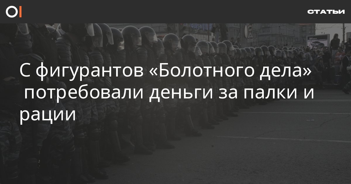 Впервые шестерым фигурантам «Болотного дела» — спустя шесть лет после событий 2012 года — предъявили иск о возмещении имущественного ущерба. Управление на транспорте МВД по Центральному федеральному округу хочет взыскать 43,800 рублей за две радиостанции «Волна» и пять резиновых палок. По версии полицейских, они были утеряны 6 мая на Болотной площади.