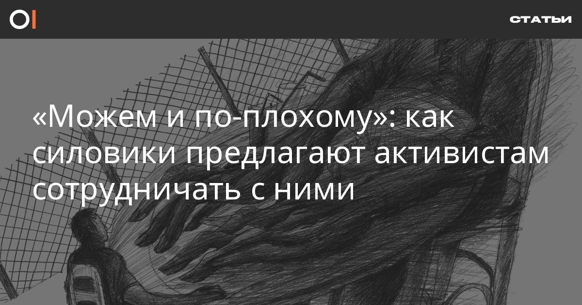 Установление неформального контакта с активистами и попытки заключить с ними соглашение о сотрудничестве — за последние годы эти действия стали неотъемлемой частью работы силовиков в России. Журналист Мария Климова расспросила активистов и рассказывает, как избежать принудительного сотрудничества и что делать, если оперативники ФСБ и Центра «Э» все-таки добились встречи с вами.