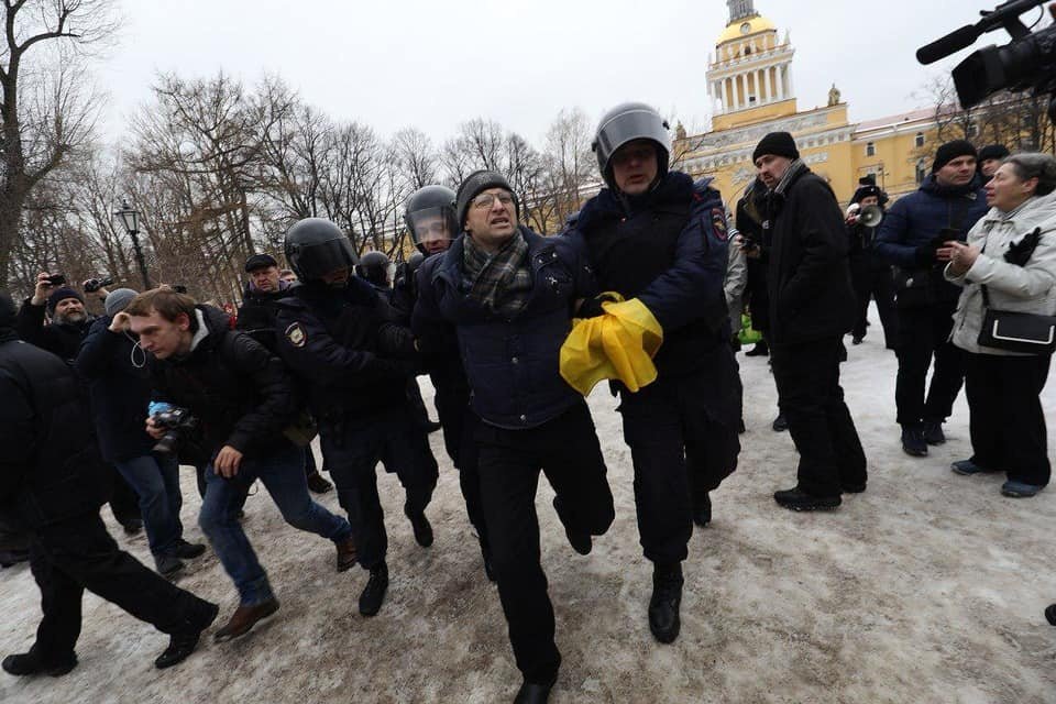 <…> Я увидел две параллельные цепи космонавтов (ОМОНа — ОВД-Инфо). <…> Крикнул, что нас окружают, и чтобы люди шли в сторону Исаакия, но докричать это толком уже не успел. Услышал рядом слова: «Давай этого с флагом». Затем двое схватили за руки, третий сзади взял за плечи и повели меня в автозак. <…>