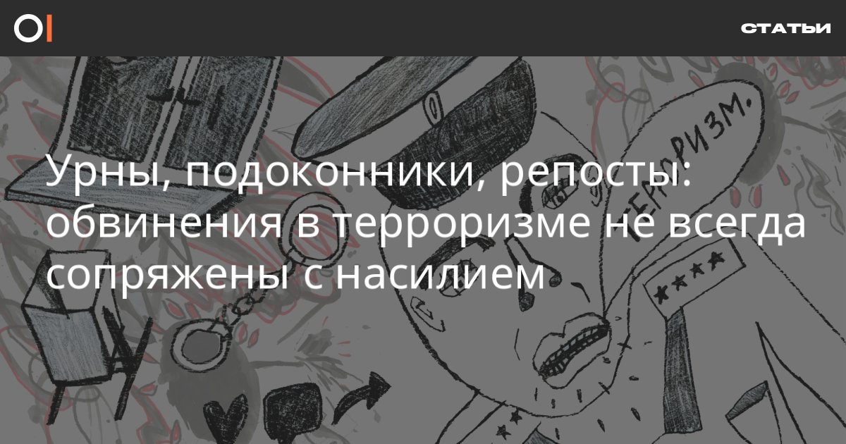 Политические уголовные дела, по данным ОВД-Инфо, в последние годы все чаще заводят по «террористическим» статьям. В списке Росфинмониторинга «террористов» тоже стало существенно больше. При этом часто сложно понять, почему тот или иной поступок правоохранители интерпретируют как связанный именно с террором. Обвинения в террористических преступлениях регулярно получают люди, занимавшиеся ненасильственной деятельностью.