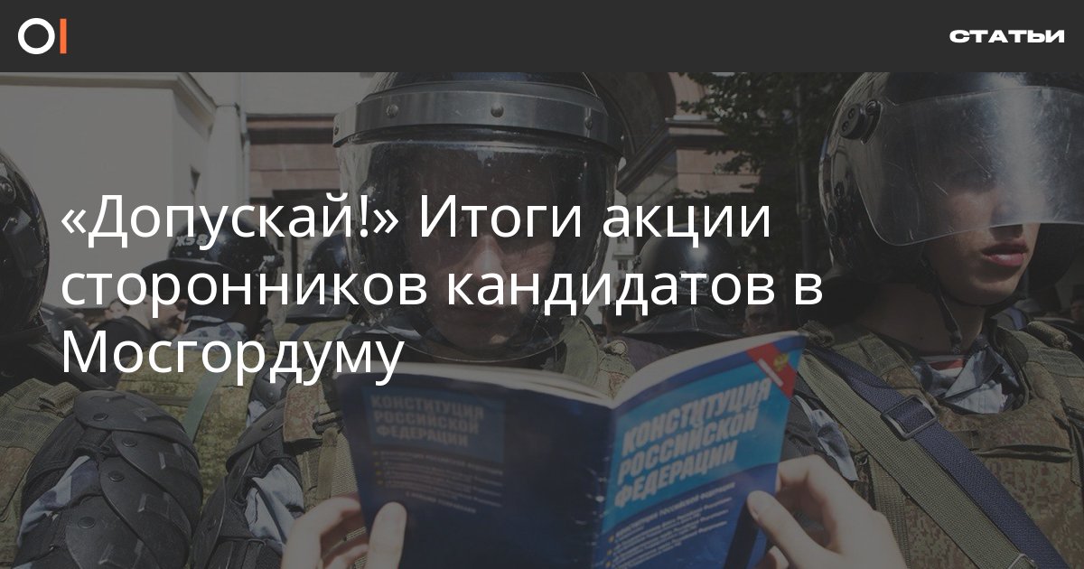 В Москве прошла акция в поддержку оппозиционных кандидатов в депутаты Московского городской думы. По данным МВД, в ней приняло участие 3500 человек. В действительности, вероятно, в акции участвовало намного больше людей. Протестующие планировали собраться у здания мэрии, но силовики блокировали все подходы к ней, и начали оттеснять людей. Участники акции прошлись шествием по улицам Москвы. ОВД-Инфо подводит итоги этого дня.