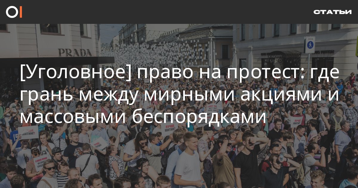 В России массовые протестные акции часто кончаются силовым разгоном мирных протестующих. Полицейские необоснованно применяют насилие, но фигурантами уголовных дел становятся не они, а демонстранты. Так появились «болотное», «московское», «ингушское» дела. ОВД-Инфо спросил экспертов, где проходит грань между протестующим и участником массовых беспорядков с точки зрения российского права, международного и в общественном сознании.