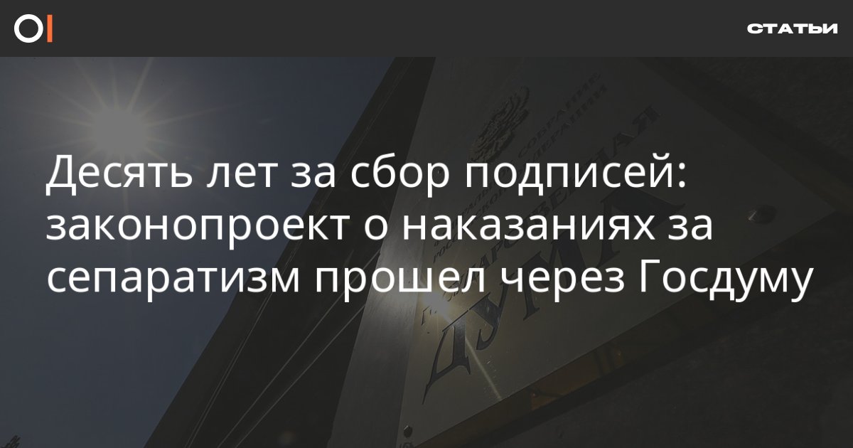 Госдума в трех чтениях приняла законопроект, уточняющий наказания за призывы и действия по отделению территорий от России. В КоАП появится статья за высказывания, уголовная ответственность наступит, если вас дважды за год захотят наказать за призыв что-то отделить от России. Вводится новая статья УК, наказывающая (от 6 до 10 лет) за ненасильственные действия по отчуждению территорий: например, сбор подписей за проведение референдума.