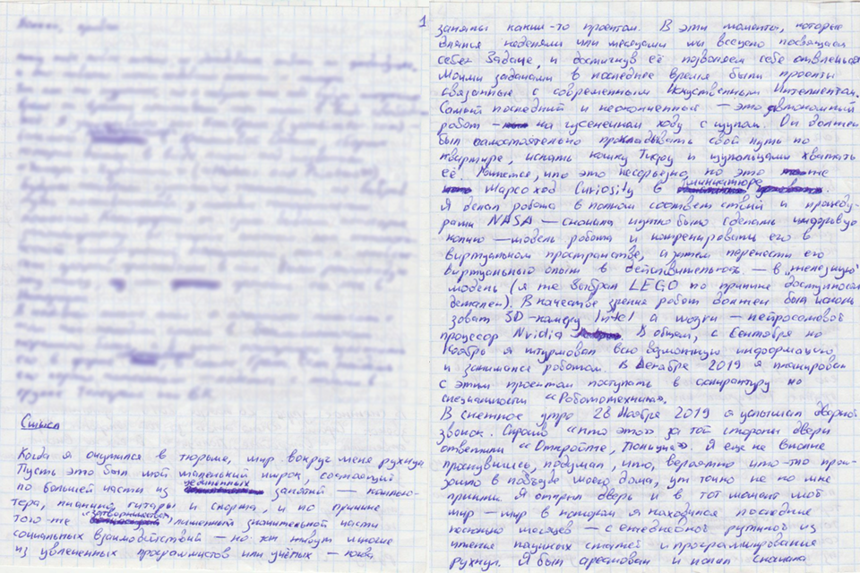 В снежное утро 28 ноября 2019 года я услышал дверной звонок. Я спросил, кто это, и с той стороны двери ответили: «Откройте, полиция». Я, еще не вполне проснувшись, подумал, что, вероятно, что-то произошло в подъезде моего дома, и уж точно не по мне пришли. Я открыл дверь и в тот момент мой мир — мир, в котором я находился последние несколько месяцев, с ежедневной рутиной из чтения научных статей и программирования — рухнул. Я был арестован и попал сначала в ИВС (изолятор временного содержания), а потом в СИЗО (следственный изолятор) и ИК (исправительная колония), так как за несколько месяцев до этого участвовал в оппозиционных митингах. Я попал в тюрьму.