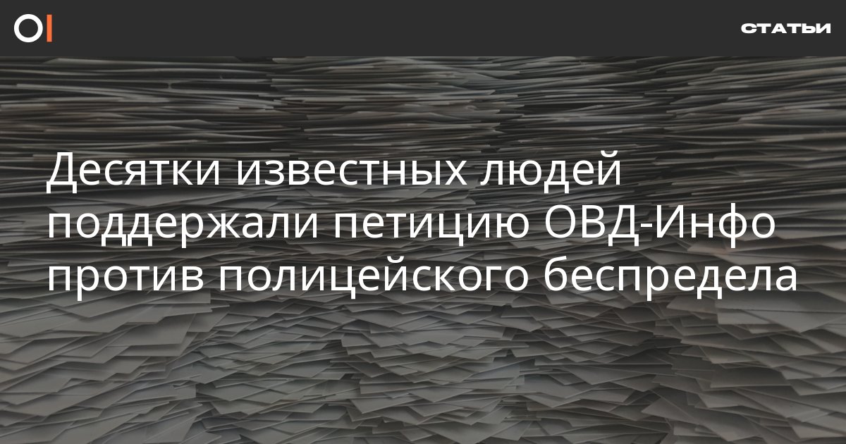 Петицию «ОВД-Инфо» против полицейского произвола поддержали больше трех десятков известных музыкантов, актеров, бизнесменов, кинокритиков и других инфлюенсеров. На сегодняшний день она собрала уже около 70 тысяч подписей.