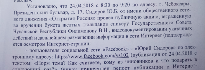 В сентябре 2018 года в Чувашии экс-координатор движения Юрий Сидоров подарил букет желтых тюльпанов председателю местного госсовета Валерию Филимонову. Так он хотел напомнить о праздничном мероприятии «Сильный президент, сильная Россия», на которое власти региона пригласили певицу Наташу Королеву (у нее есть песня «Желтые тюльпаны»). Силовики посчитали, что Сидоров таким образом провел акцию от имени «нежелательной» британской организации Open Russia. Суд оштрафовал активиста на шесть тысяч рублей. То же произошло и с последующими его подарками местным чиновникам — игрой «Мафия» и антиутопией Джорджа Оруэлла «1984» — штраф 14 тысяч рублей. За день до ликвидации «Открытой России» стало известно, что Сидорова объявили в федеральный розыск, он стал восьмым человеком, которого преследуют по уголовной статье о деятельности «нежелательной организацией».
