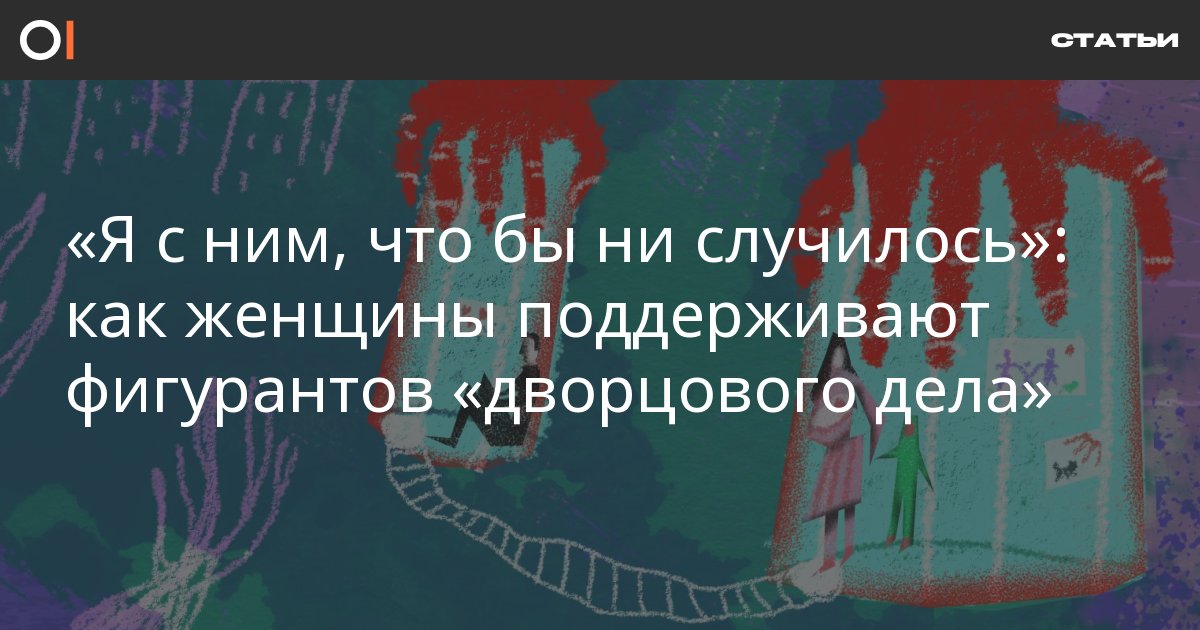 Зимой 2021 года прошли массовые акции протеста во многих городах России, катализатором которых стало расследование «Дворец для Путина». За несколько дней полицейские задержали более 17 тысяч человек, а не менее 138 из них стали обвиняемыми по «дворцовому делу». Партнерши и подруги фигурантов дел часто остаются в таких историях за кадром, хотя именно на них ложатся поддержка заключенных и домашние дела.