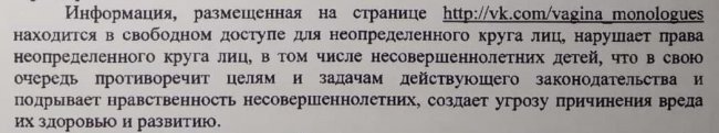 Центральный районный суд в Комсомольске-на-Амуре запретил распространять информацию из сообщества «Монологи вагины». В постановлении говорилось, что в паблике «выявлена информация, причиняющая вред здоровью, нравственному и духовному воспитанию несовершеннолетних». Речь шла о стилизованных художественных изображениях женских половых органов.