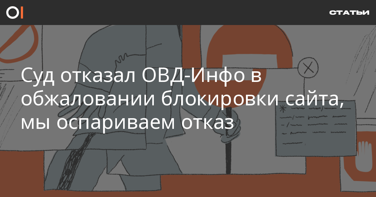 В декабре прошлого года сайт ОВД-Инфо заблокировали по решению Луховицкого городского суда Московской области. Мы обжаловали решение, однако суд заявил, что наша жалоба составлена неправильно: якобы в ней нет четкого указания на владельца домена нашего сайта. Мы не согласны с этим и оспариваем отказ суда.