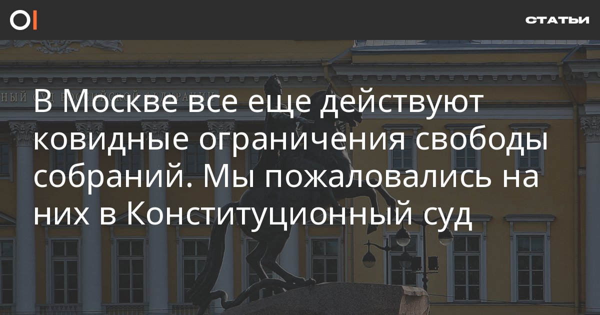 Юристы ОВД-Инфо отправили в Конституционный суд жалобу в интересах москвички Екатерины Бажановой — вместе с ней мы оспариваем запрет публичных мероприятий из-за коронавирусных ограничений. Почти все запреты времен пандемии уже отменены: проводятся футбольные матчи и концерты с тысячами зрителей, работают кафе, можно даже не носить маски в метро. А публичные мероприятия — в том числе и одиночные пикеты — все еще запрещены.