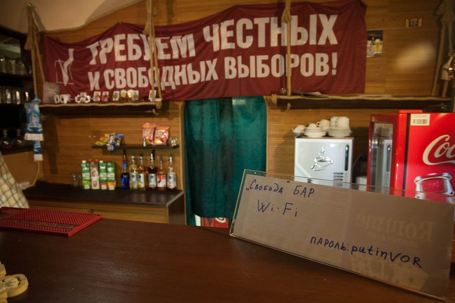 В баре «Свобода» посетители могли встретить как портреты Че Гевары, так и транспаранты с требованием честных выборов или книги Немцова, с барной стойки подавали пиво «Пролетарское» и коктейль «Жлоб» — по прозвищу тогдашнего губернатора Петербурга Георгия Полтавченко. А пароль от вайфая был putinvor. В помещении проходили лекции, дискуссии и дебаты, «Молодая гвардия Единой России» даже подсылала несовершеннолетних активистов для покупки алкоголя.