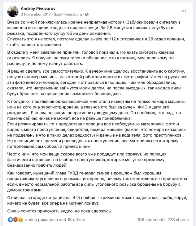 Евгений Ройзман вспоминает, как в 2017 году у Пивоварова украли ноутбук из машины. Оппозиционеру удалось самому раскрыть это дело. Все доказательства он принес в полицию и попросил найти преступника. Полиция не стала этого делать, сославшись на то, что им надо готовиться к грядущим протестным митингам. Пивоваров разозлился и раскритиковал МВД в Facebook. Правоохранители посчитали, что пост порочит их репутацию, и подали в суд, однако дело с треском проиграли.