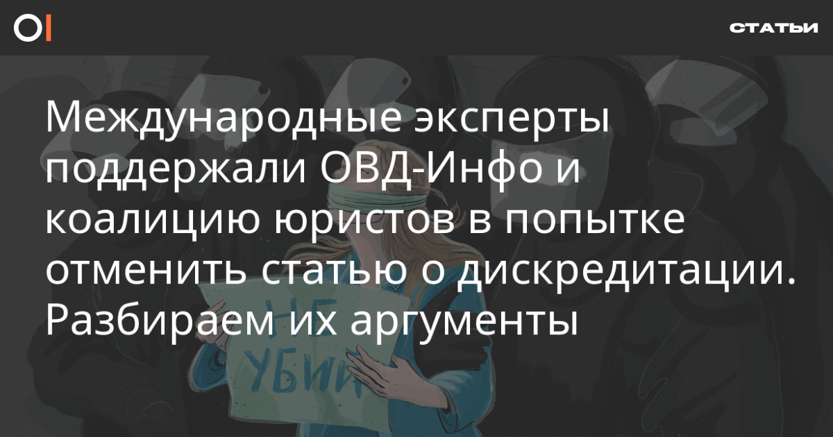 Такой же позиции придерживаются и юристы из международных организаций. Они подготовили три документа, в которых объяснили, почему преследование по статье о «дискредитации армии» нужно считать незаконным и как подобные случаи решались в международной практике.
