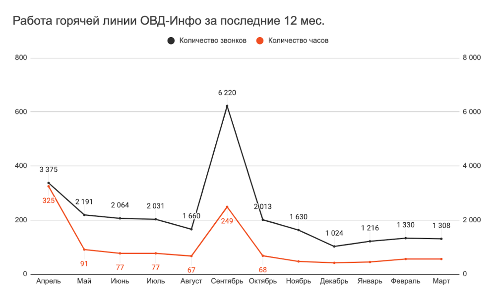 В марте 1 308 звонков прошли через нашу горячую линию. В общей сложности наши операторы и волонтеры говорили по телефону 56 часа 10 минут 49 секунд.