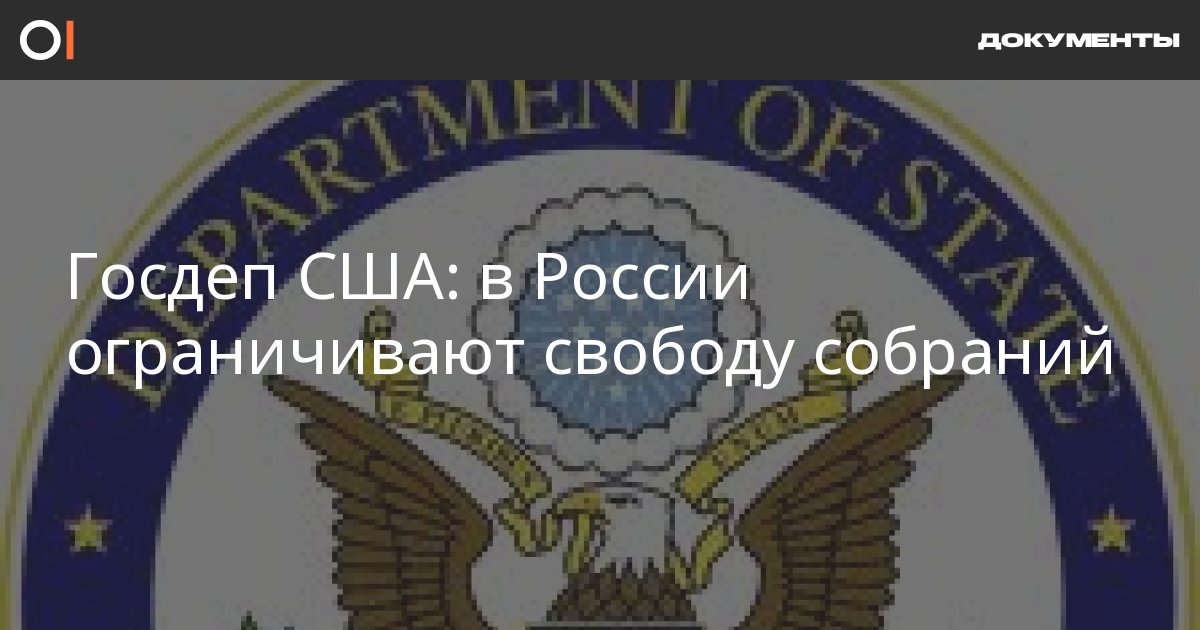 В России «закон предусматривает свободу собраний, но на практике местные власти продолжают ограничивать это право», говорится в докладе госдепа. Упоминая, что российское законодательство о публичных мероприятиях носит уведомительный характер, в докладе уточняется, что в 2011 году «чиновники выборочно отказывали некоторым группам в разрешение или предлагали альтернативные места, расположенные неудобно». При этом «митинги без официального разрешения часто разгонялись полицией». Описывая сложившаюся политику относительно проведения митингов, авторы доклада пишут: «Многие наблюдатели отмечают укоренившуюся практику избирательного подхода, когда чиновники поощряют проправительственные митинги и предотвращают политически чувствительные демонстрации».